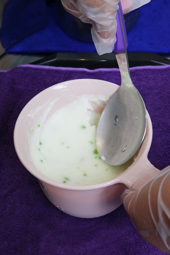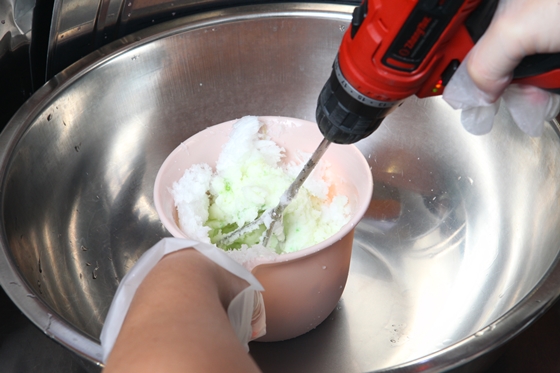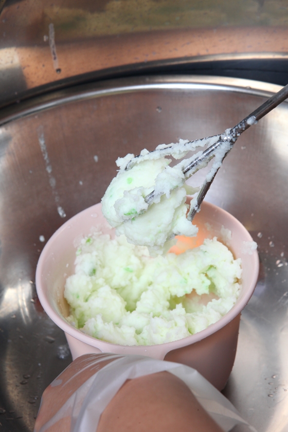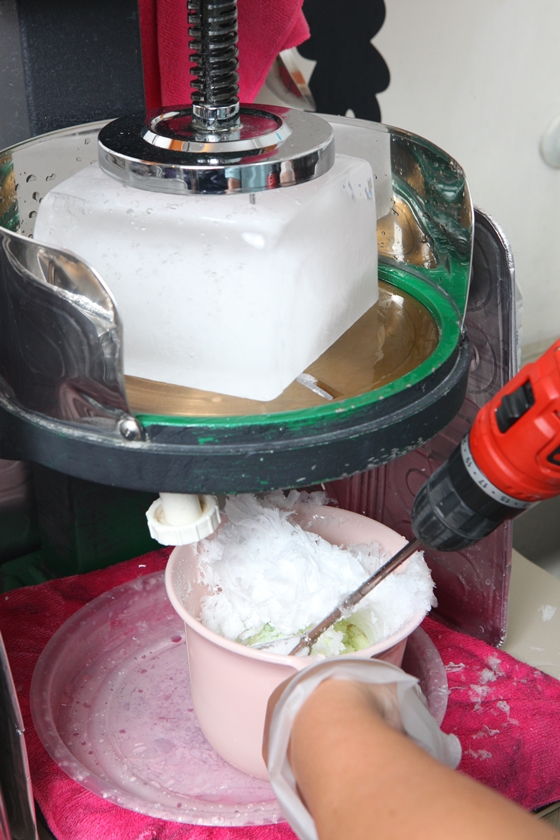 客人選擇好口味後,會在盆子內加入刨冰,以電動攪拌器開始攪拌,讓泡泡冰越攪越綿密,越吃越順口。